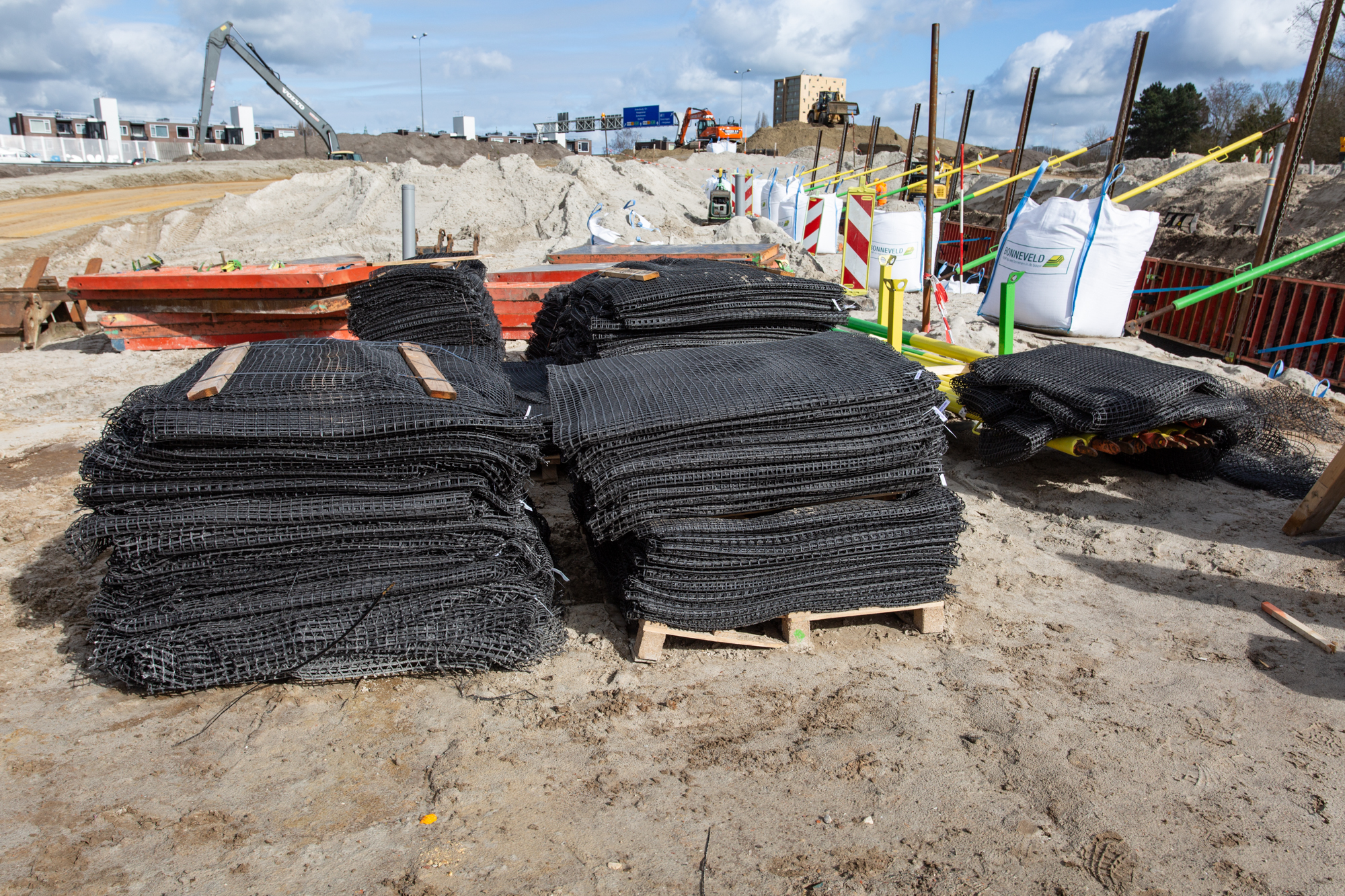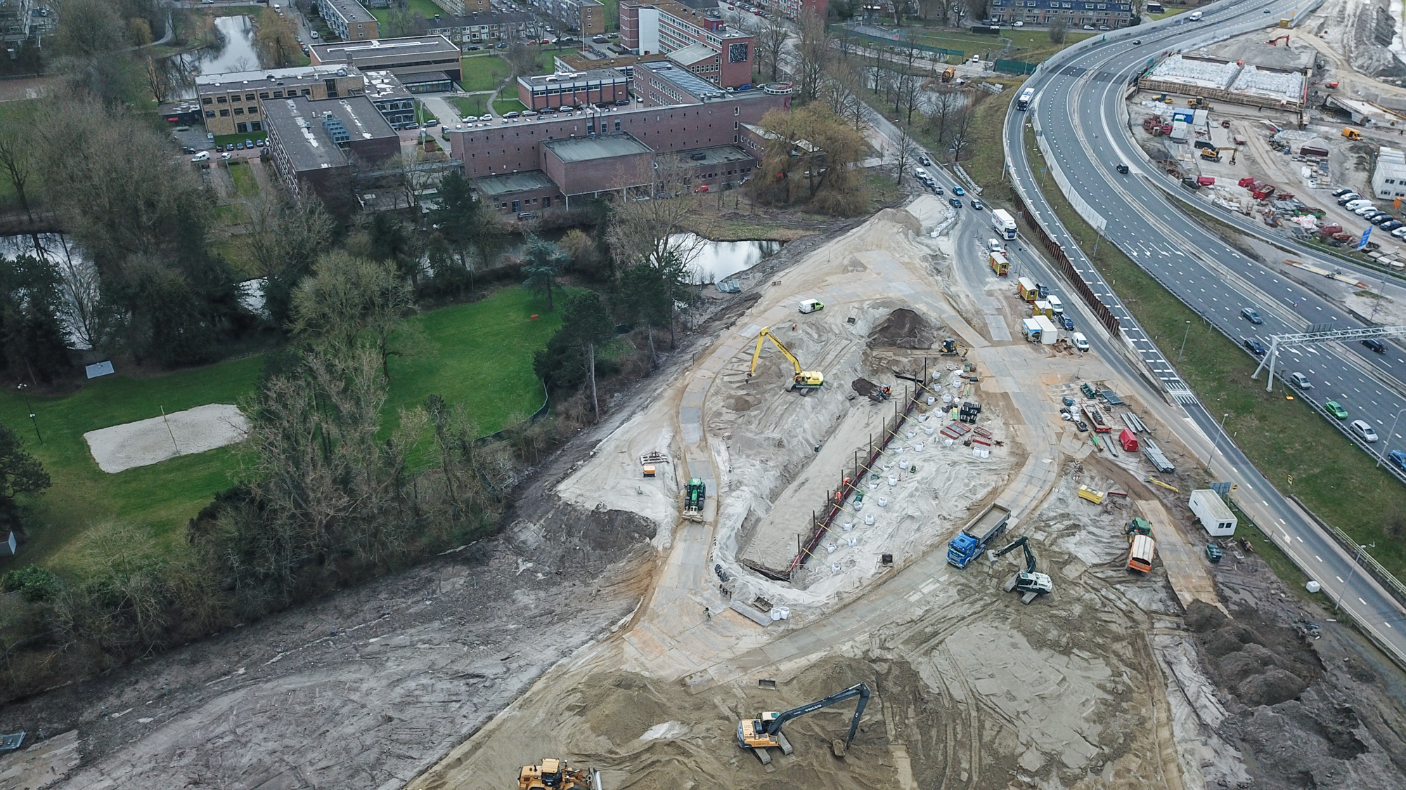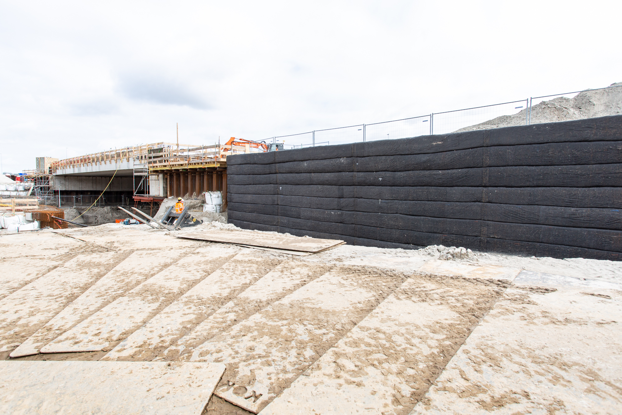 Joosten Concepts partner Geologics verzorgde de dimensionering van de gewapende grondconstructies die een tijdelijk of permanente ontlasting vormen voor (hoofdzakelijk) groenschermen en tunnelelementen. Hiervoor is gebruik gemaakt van Miragrid van Solmax, die prefab is aangeleverd door Joosten Kunststoffen. Uitvoerder Bonneveld bouwt de constructies volgens de legplannen van Geologics.