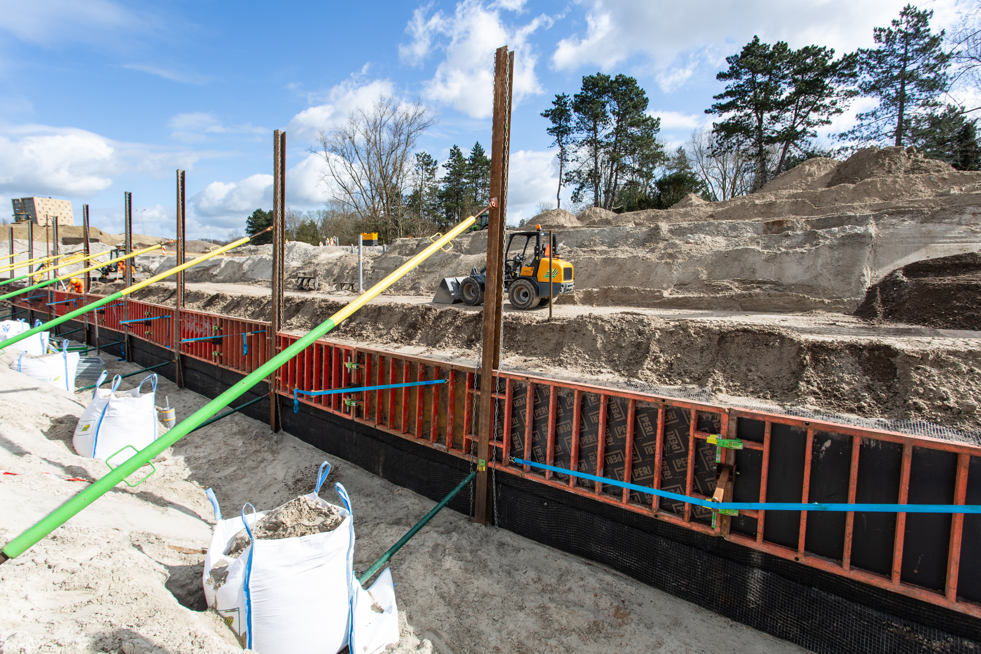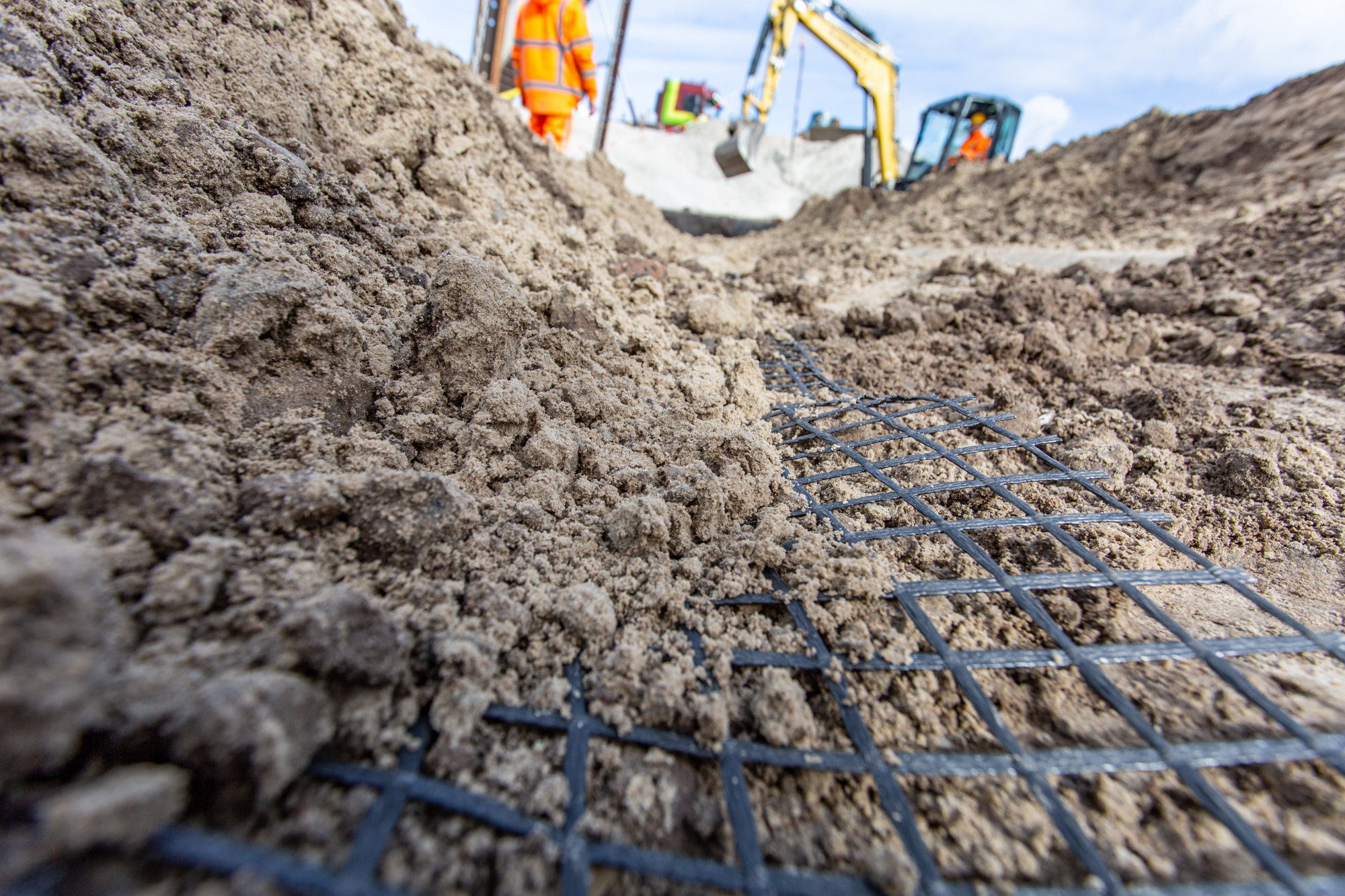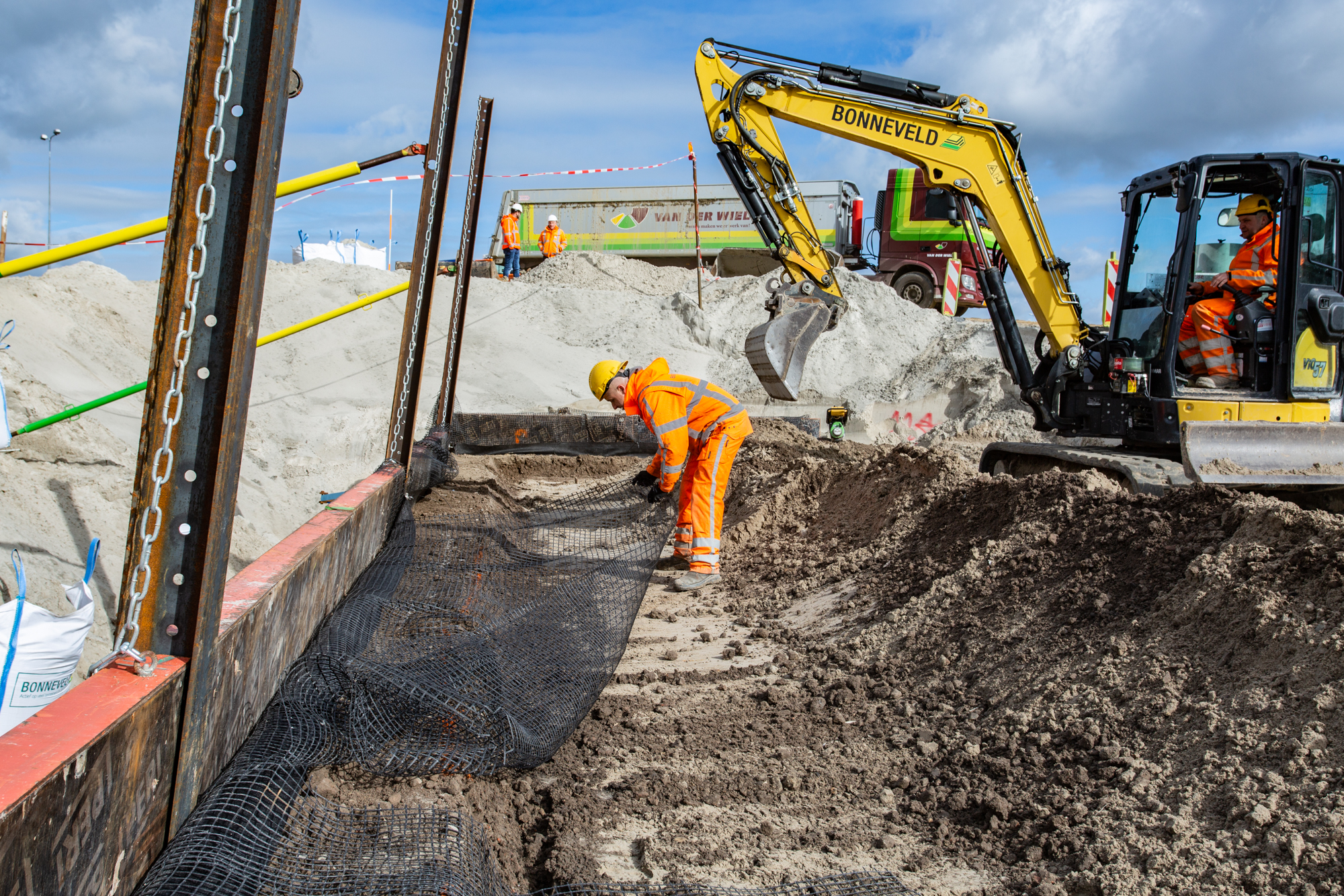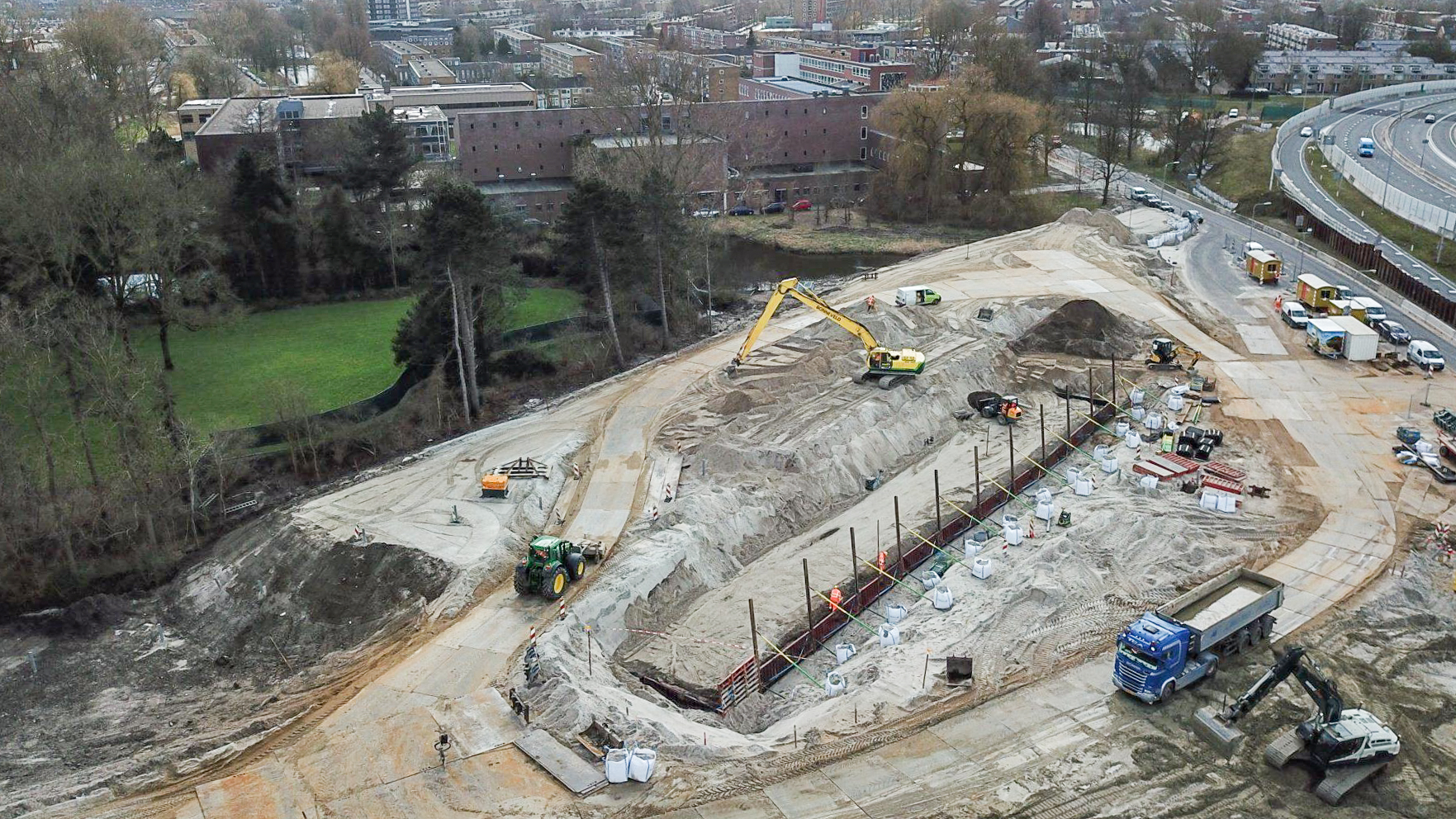 Joosten Concepts partner Geologics verzorgde de dimensionering van de gewapende grondconstructies die een tijdelijk of permanente ontlasting vormen voor (hoofdzakelijk) groenschermen en tunnelelementen. Hiervoor is gebruik gemaakt van Miragrid van Solmax, die prefab is aangeleverd door Joosten Kunststoffen. Uitvoerder Bonneveld bouwt de constructies volgens de legplannen van Geologics.