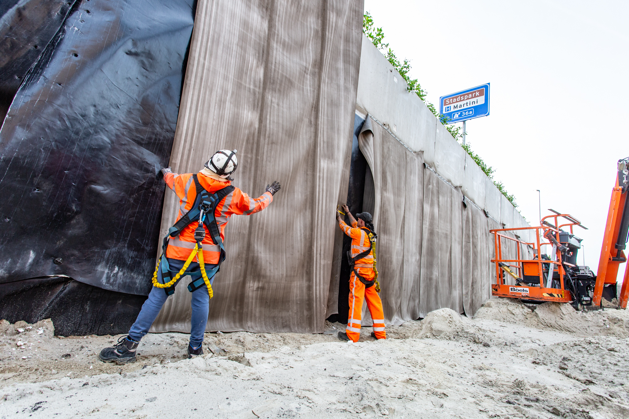 Voor dit specifieke project zijn de CC banen aan de bovenzijde op de betonnen keerwand vastgezet met staalstrips. Om de CC constructie te beschermen tegen windbelasting en de zuigende werking van langsrijdend (vracht)verkeer zijn de banen extra verankerd met, door Joosten ontwikkelde en gecertificeerde, EPS-ankerpennen. Om de EPS-constructie volledig te beschermen zijn de CC banen met folielasapparatuur aan elkaar gelast.
