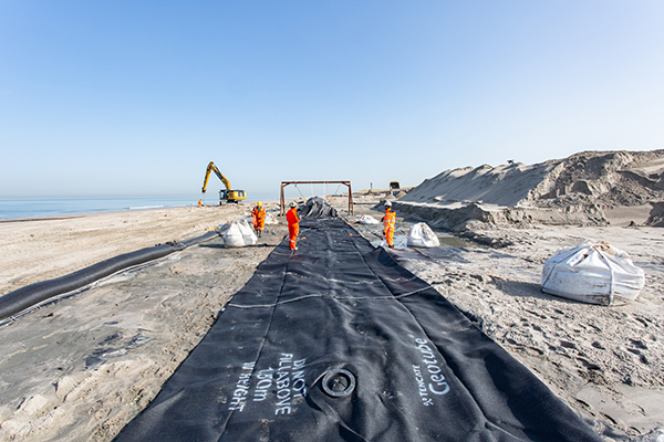 De TenCate Geotubes worden volgens meegeleverd legplan uitgelegd op het strand. Via de inlaat wordt uit de zee opgezogen zand, vermengd met zeewater in de Geotubes gepompt. Het schone water loopt door het waterdoorlatende geweven geotextiel weg, terwijl het zand achterblijft en de Geotubes vult tot ontwerphoogte. Op een aantal plaatsen is een tweede laag Geotubes toegepast om de juiste hoogte te bereiken.